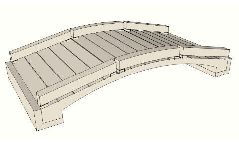 The KangaTrak bridges are either flat or arched. The flat bridge system comprise: abutments, beams, panel treads that lock together using tongue and groves on treads edges urethane pins connecting the beams to abutments. Bridges can integrate with the KangaTrak boardwalks.